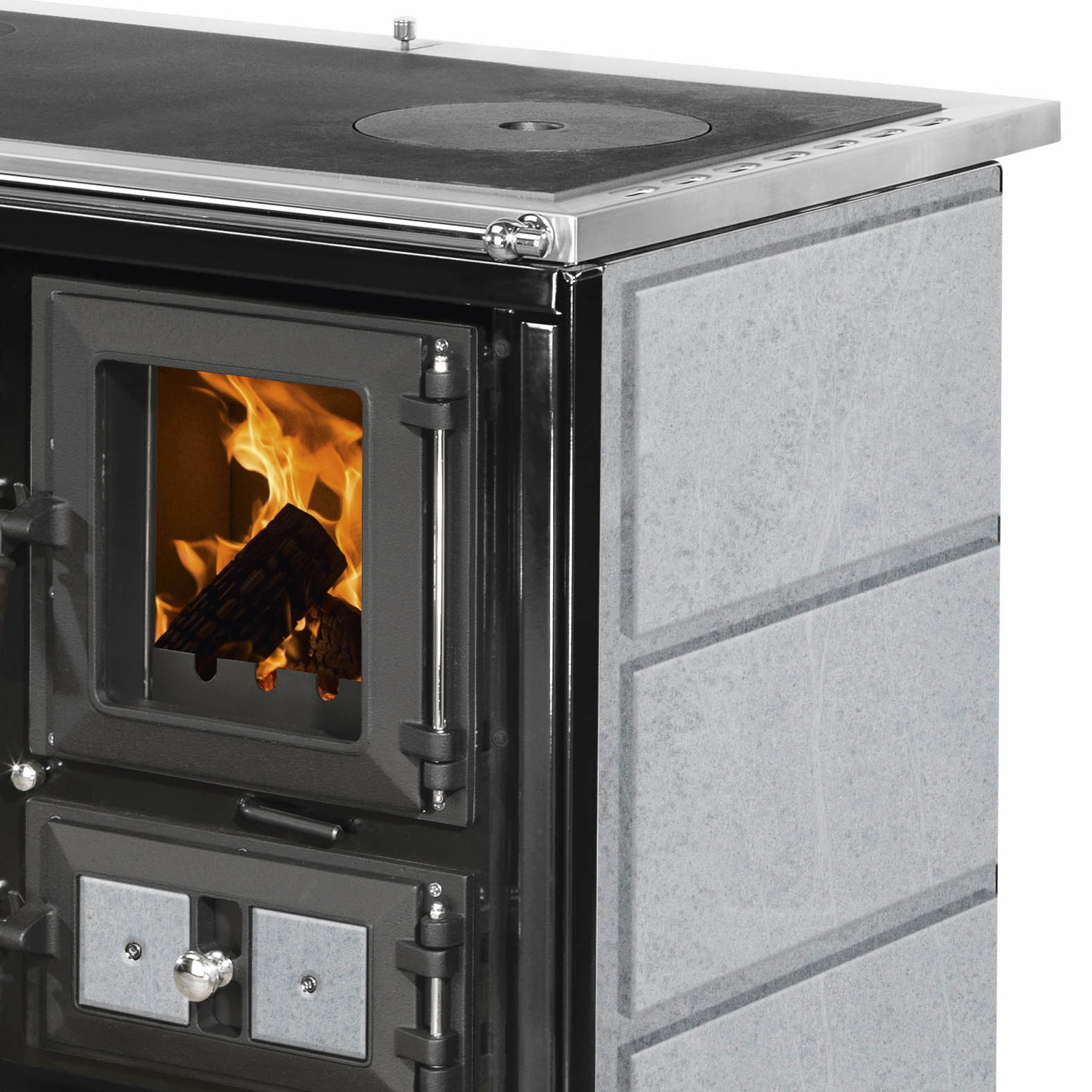 Avec le beau Rustico-90 2.0, la cuisson devient un plaisir, car le four est émaillé à l'intérieur et équipé d'un système de rails pratique pour faciliter l'insertion de la plaque de cuisson. De plus, le poêle affiche la température à l'avant grâce à un thermomètre.