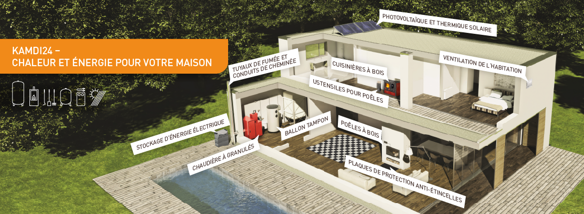 Pack complet avec capteurs solaires, ballon, échangeur de chaleur et régulation, ainsi qu’un poêle à bois, insert, module à granulés, chaudière à gazéification de bois ou à charbon.